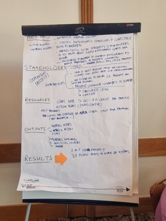 Se diseñó una propuesta colaborativa para conectar a personas migrantes recién llegadas a Gran Canaria —con experiencia en pesca— con armadores locales necesitados de tripulantes. Un reto compartido por varios GALPA de Europa (Portugal, Italia, etc.), que requiere abordar obstáculos comunes (idioma, desconfianza, desconocimiento de oferta formativa y demanda laboral). Hubo consenso en la necesidad de impulsar un proyecto de cooperación internacional para abordar esta problemática. - Simulación de acompañamiento a jóvenes emprendedores: