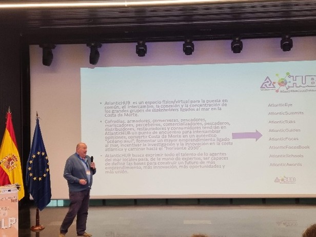 En el último bloque de experiencias inspiradoras, el gerente del GAL Costa da Morte, explicó cómo, una iniciativa puesta en marcha por una asociación de percebeiros del territorio, visibiliza a los a los agentes económicos y sociales del mismo, establece esquemas de relaciones y salvaguarda testimonios de sus habitantes, mediante la creación del Atlantic Hub Costa da Morte; el gerente del GAC Cantabria Oriental, expuso un proyecto propio del GAC, por medio del cual, se instalaron compactadoras de residuos en las embarcaciones de la costera de bonito y, por último, el gerente del grupo del País Vasco, explicó un interesante proyecto de economía circular dentro de una misma empresa, en la que, con los residuos de las algas empleadas para productos cosméticos, se elabora papel empleado para envolver dichos productos.